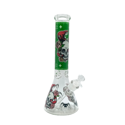 Featuring tattoo-inspired artwork of skulls, snakes, spiders, and roses across vibrant colored necks, each piece makes a statement that customers won’t forget. The wide beaker base ensures stability, while the ice pinch lets smokers cool down their rips for a clean, chill session.
