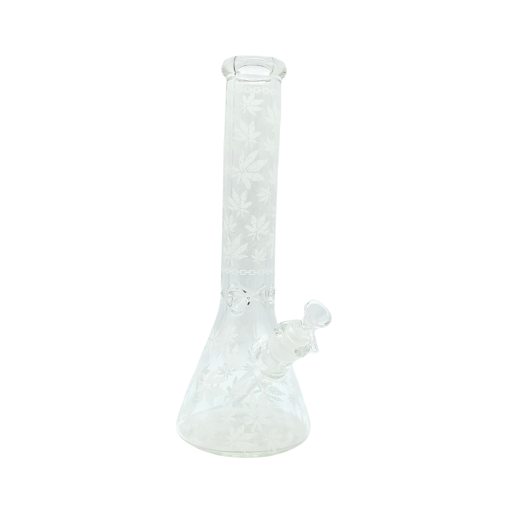 • 14-inch beaker bong with glow-in-the-dark pot leaf design