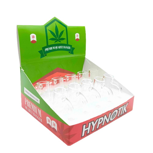 Keep your dab lineup versatile with this 10-piece display of Round Bottom 90° Quartz Bangers. The rounded bottom design helps concentrate heat and prevents product from getting stuck in corners, making for smoother, more efficient sessions. Crafted from durable quartz, these bangers retain heat well and pair easily with most rigs thanks to the 90° joint.