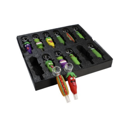 DISPLAY OF 12 GLASS PIPES WITH SILICONE CARTOON EXTERIOR COVER