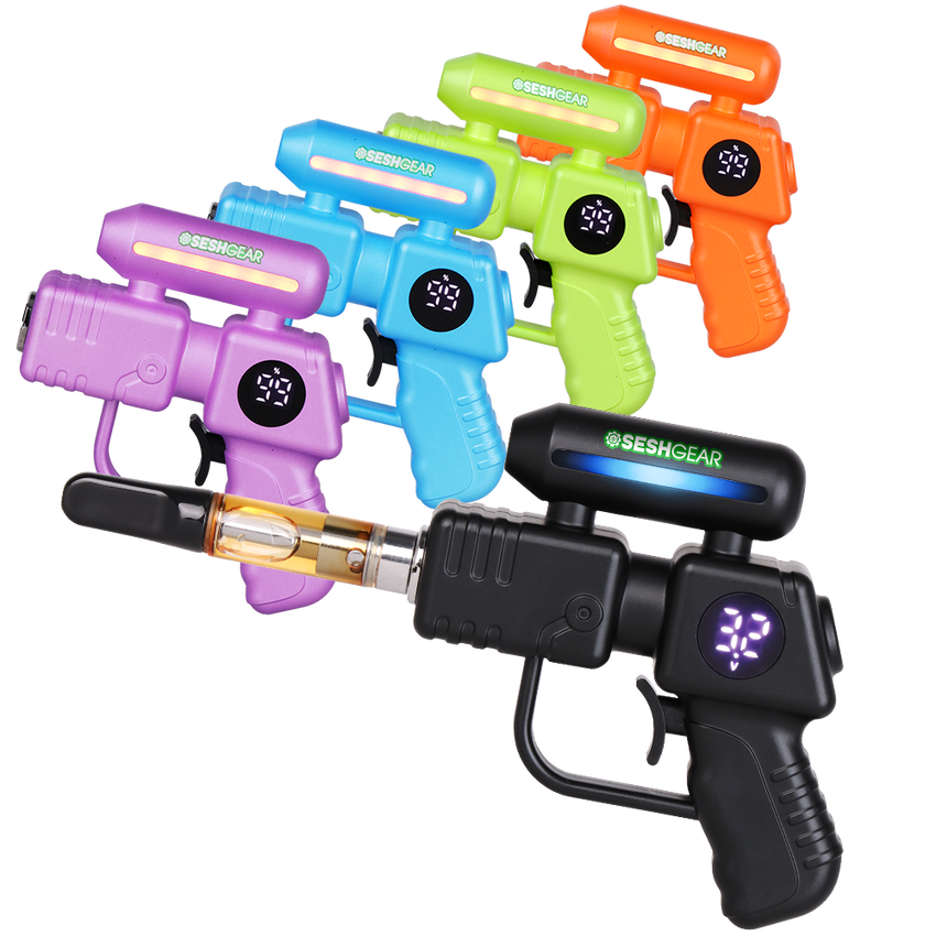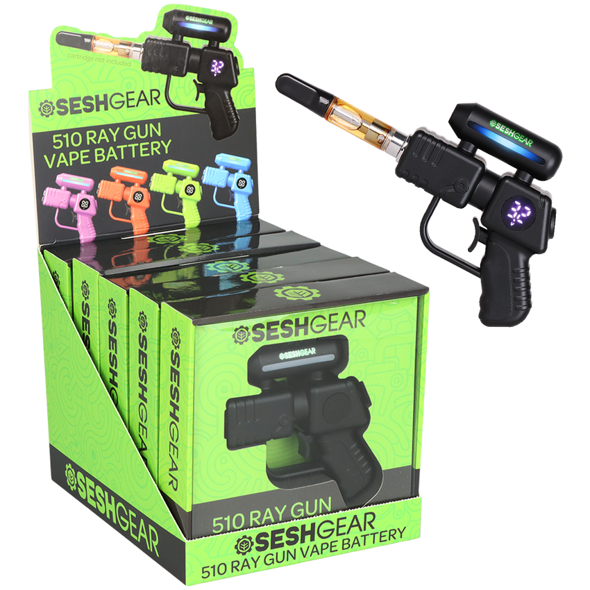 The SeshGear Ray Gun 510 Vape Battery is totally out of this world! The battery has 5 preset voltage settings to choose from with LED lights to indicate current setting and battery life. Use almost any size of cartridge with the vape’s universal 510 threading. The device is crafted in the shape on an alien ray gun with the trigger as the single control button. Users can prep their carts with the 12-second preheat function and keep track of the current voltage and battery life on the digital display screen. Charge up quickly with USB-C charging (charger not included). Available individually or as a 5-count assorted display. Multiple color options available.