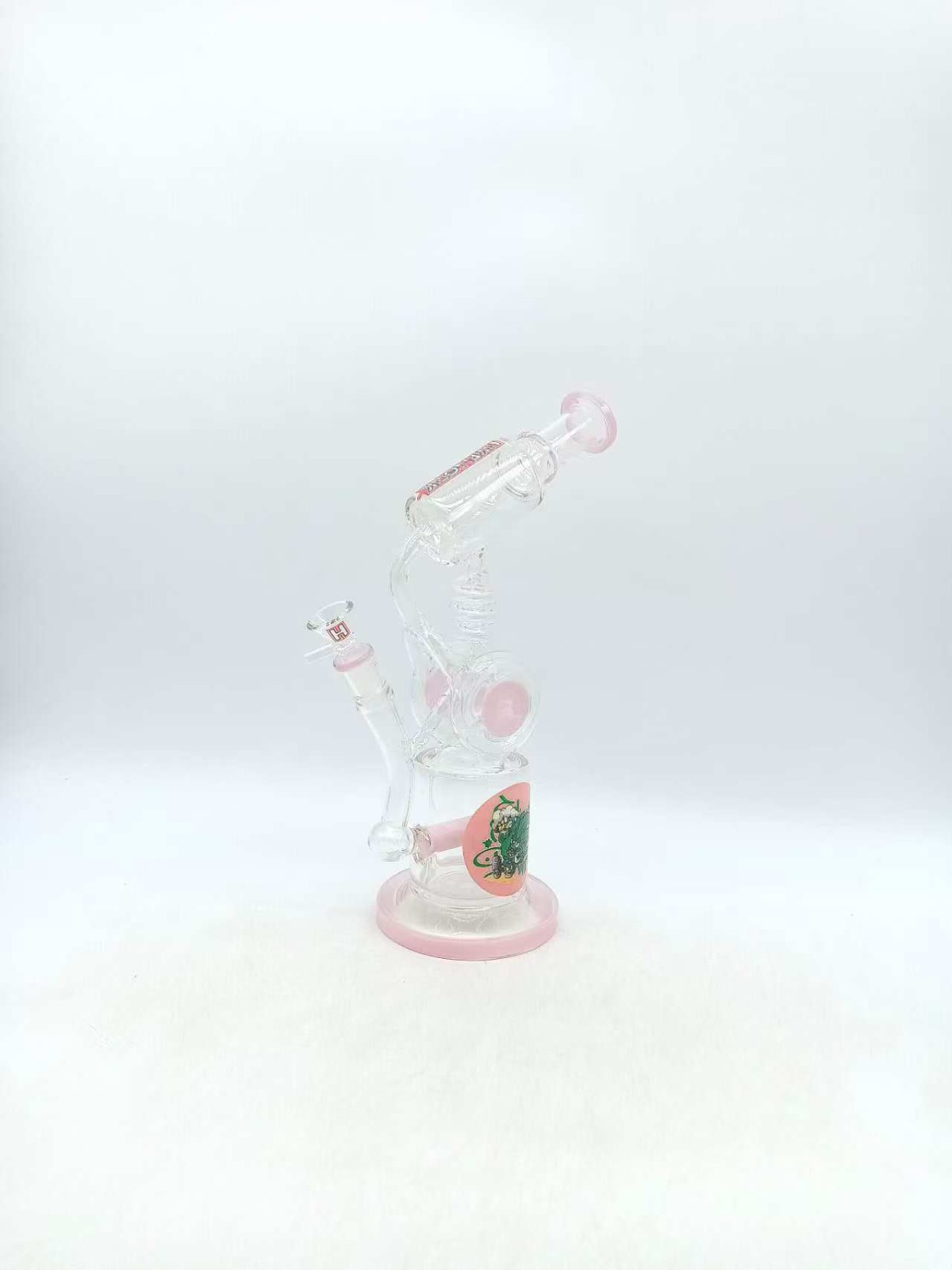 / HYPNOTIK 12.5 INCH DOUBLE BARREL SPIRAL RIG WITH IN-LINE PERK. COMES WITH BOWL AND BANGER, MILK PINK