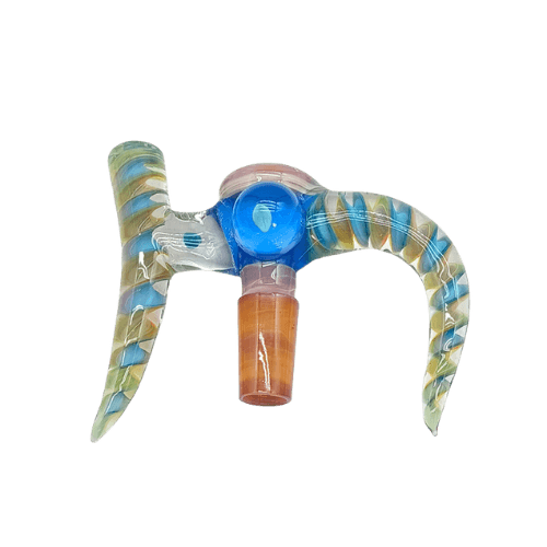 Add eye-catching style to your bowl selection with this swirling, horned glass piece — a true upgrade from basic clear slides. Crafted from thick, heat-resistant borosilicate, each bowl features a twisting color pattern and sculpted horns that double as built-in grips for safer handling and cool visual appeal. Perfect for customers looking to customize or refresh their favorite rigs.
