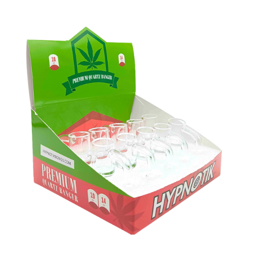 Keep the dabbing essentials stocked with this 10-piece display of flat top 90° quartz bangers. The flat top design ensures a tight seal with carb caps for improved airflow and efficiency, while the 90° angle fits most standard rigs with ease. Built from durable quartz, these bangers heat evenly and hold temperature for smooth, consistent sessions.