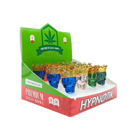 Add some royal edge to your lineup with this 12-piece display of Colored Crowned Skull Glass Bowls. Each bowl is crafted from durable glass and designed with a detailed crowned skull motif, giving customers a striking mix of dark style and regal flair. The assorted vibrant colors make them stand out in any display, while the universal fit works with most standard water pipes and rigs.
