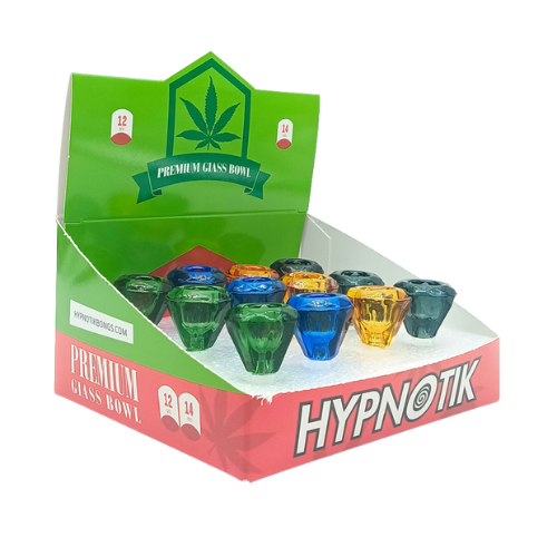 Add some sparkle to your accessory lineup with this 12-piece display of Colored Diamond Glass Bowls. Crafted from durable glass and shaped with a faceted diamond design, these bowls offer both style and function. The assorted vibrant colors make them stand out on the shelf, while the universal fit ensures compatibility with most standard water pipes and rigs.