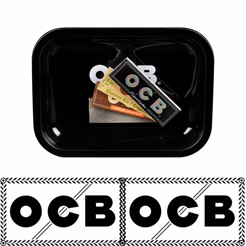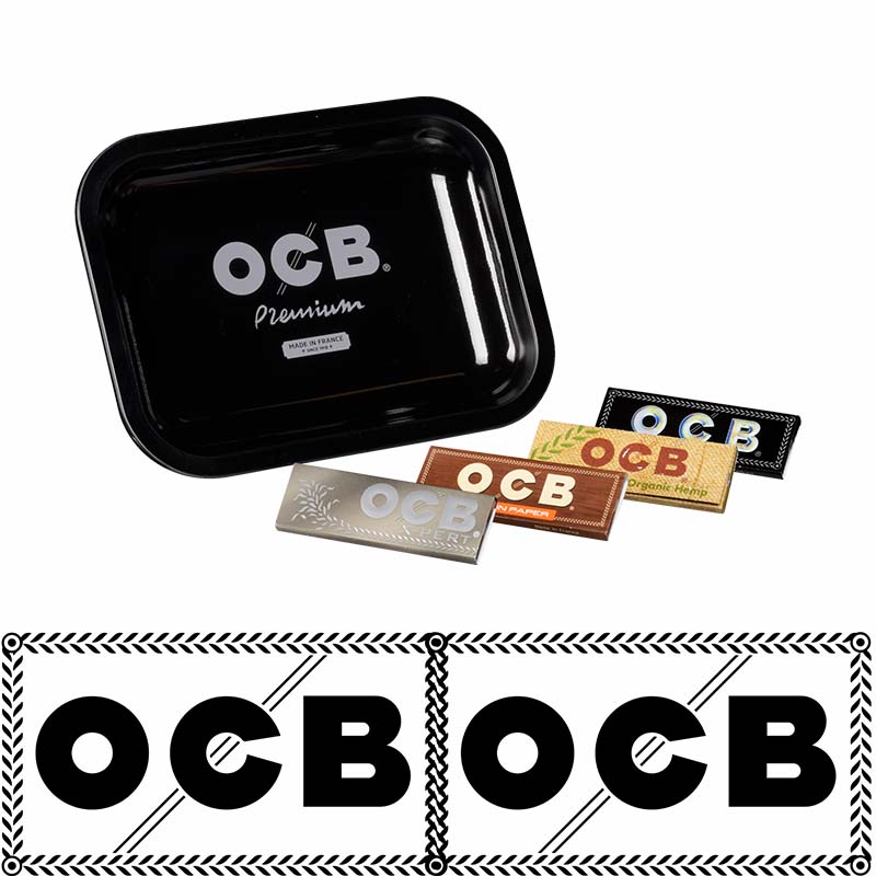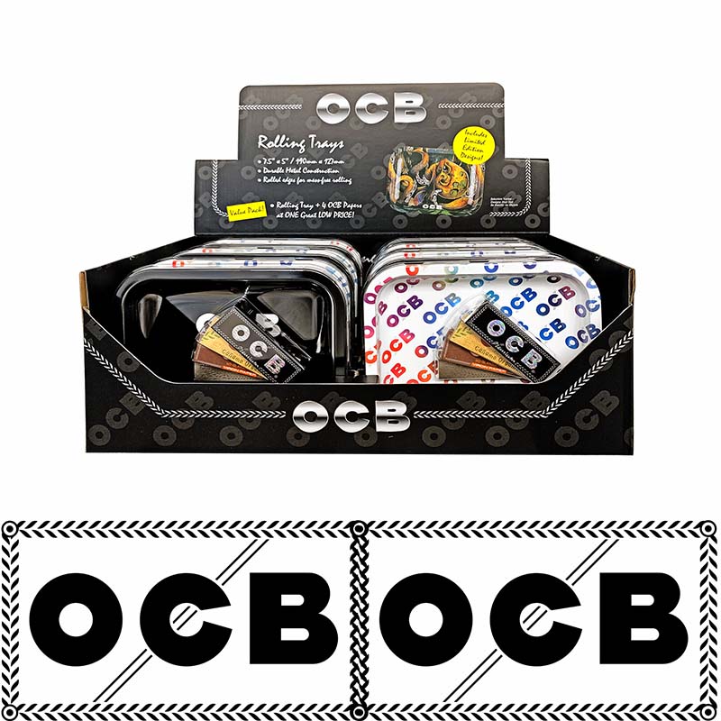 DISPLAY OF 12 OCB ROLLING TRAYS WITH 4 PACKS OF OCB 1-1/4 PAPERS PER TRAY