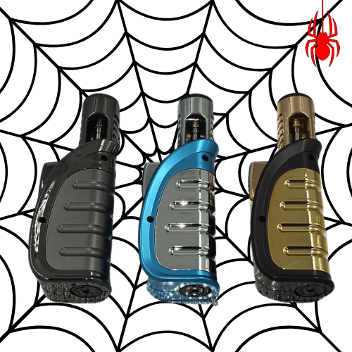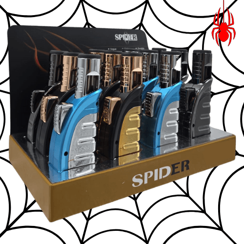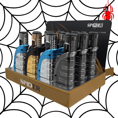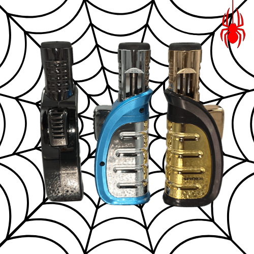 SPIDER SINGLE FLAME CURVED HANDHELD METALLIC TORCH. COMES IN A DISPLAY OF 12. $168 PER DISPLAY ($14 PER PIECE) MSRP $29.99