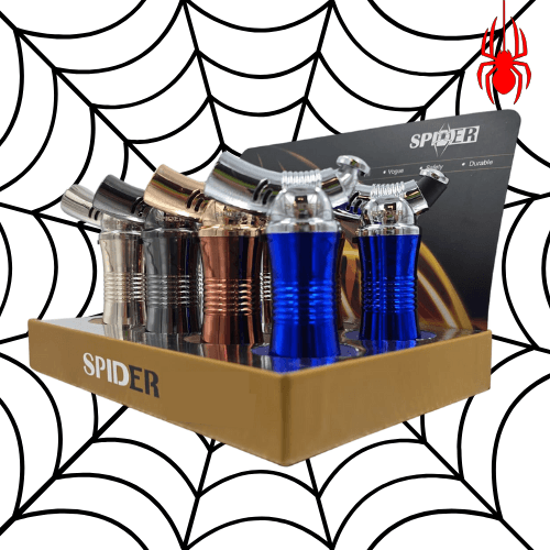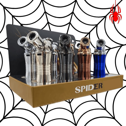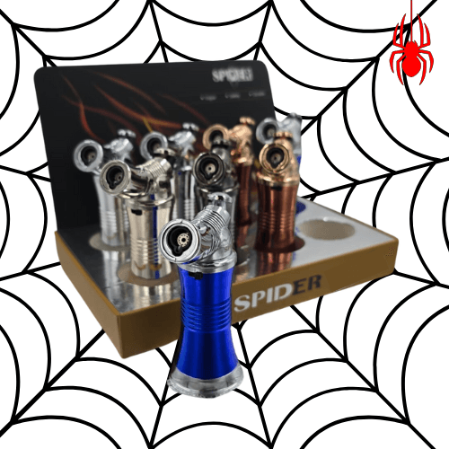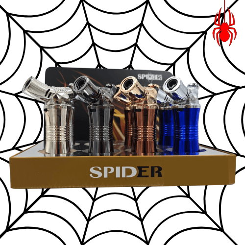 SPIDER SINGLE FLAME CURVED HANDHELD TORCH WITH LOCK. COMES IN A DISPLAY OF 8. $96 PER DISPLAY ($12 PER PIECE) MSRP $24.99